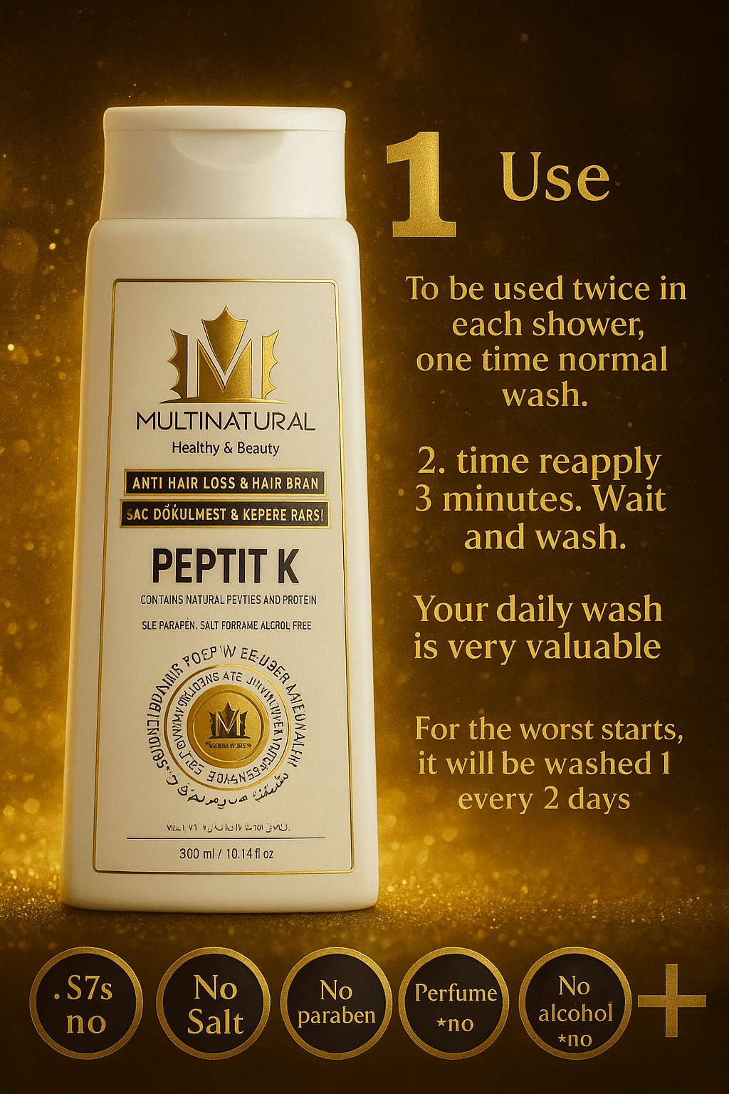 شامبو PEPTIT K من العلامة التركية MULTINATURAL هو تركيبة متطورة غنية بالبروتينات والفيتامينات الطبيعية، تم تصميمها خصيصًا لعلاج تساقط الشعر، القشرة، والجفاف، مع تنشيط فروة الرأس ومنحها الحيوية والنضارة.